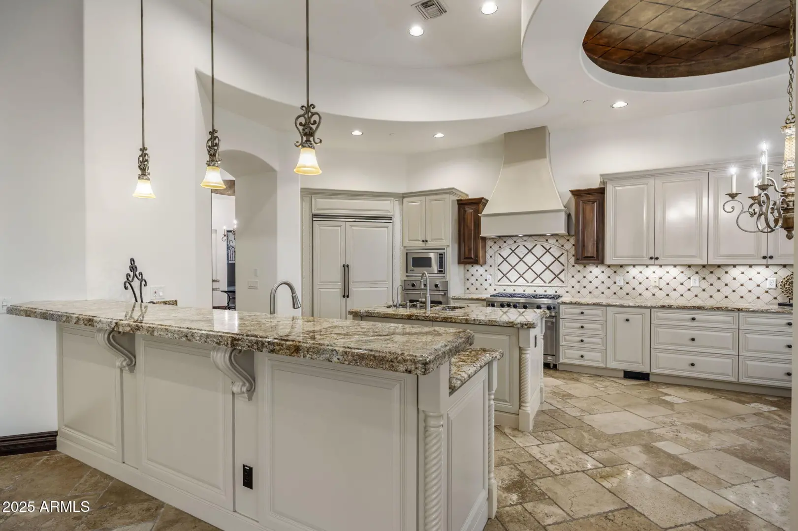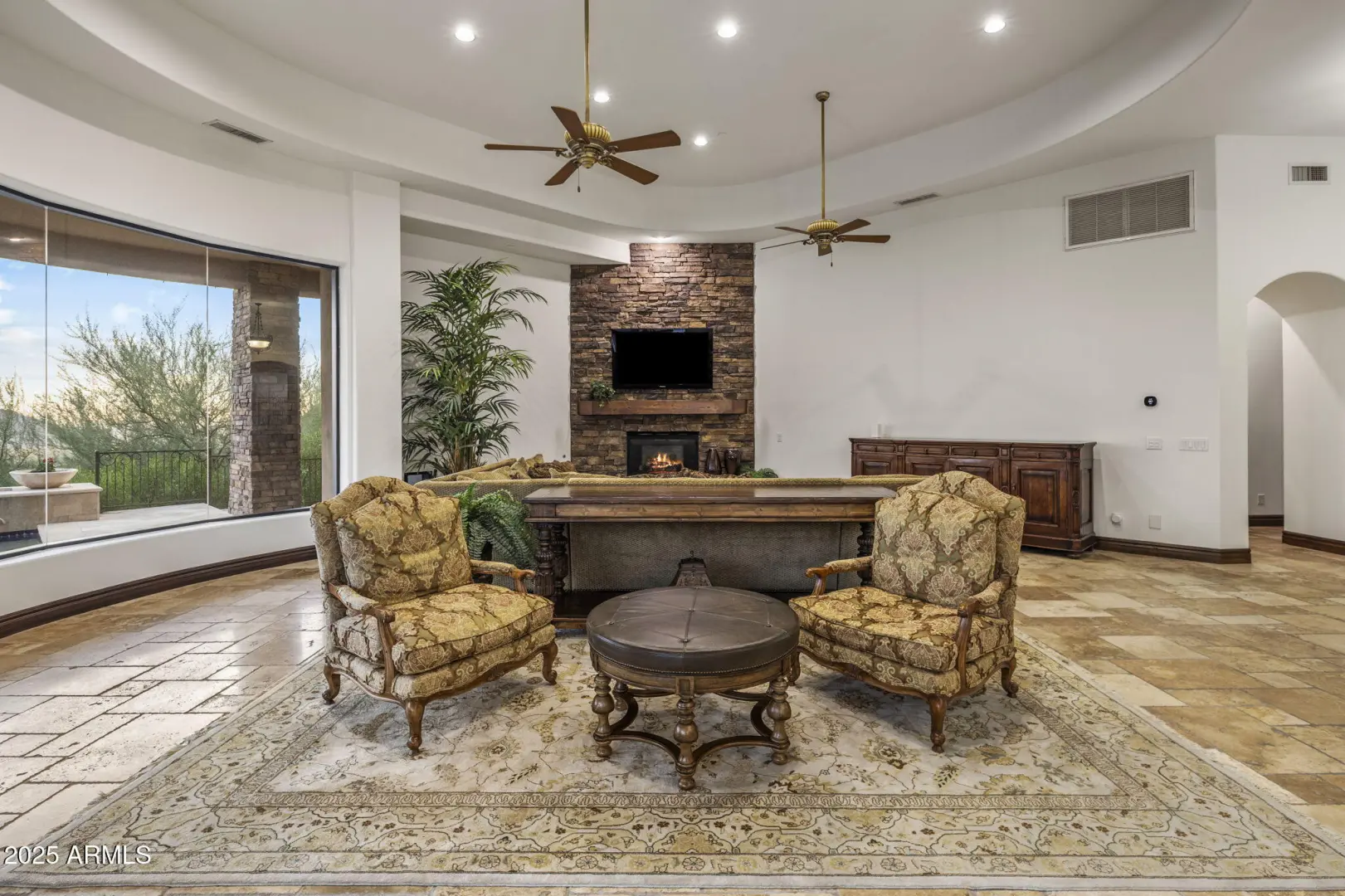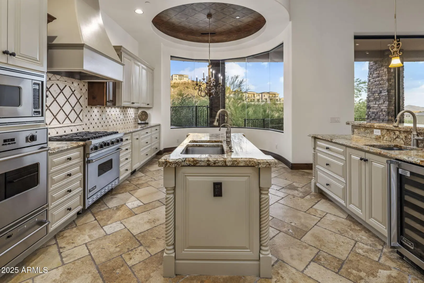 Enjoy breathtaking city lights and mountain views in this entertainer's dream home! Every detail has been meticulously crafted. Recently painted throughout, this home feels fresh and modern. The spacious great room features a cozy fireplace and offers an unobstructed panoramic view through retractable glass pocket doors and a seamless wall of butt-glazed windows. Step outside to a stunning outdoor area complete with a negative-edge pool, spa, and built-in BBQ. The gourmet kitchen—recently updated—features top-of-the-line Viking appliances, a custom 336-bottle wine room, elegant travertine flooring, and granite countertops throughout. Updated bathrooms add to the refreshed feel, combining luxury with thoughtful design. The entry boasts a striking glass and iron door, complemented by