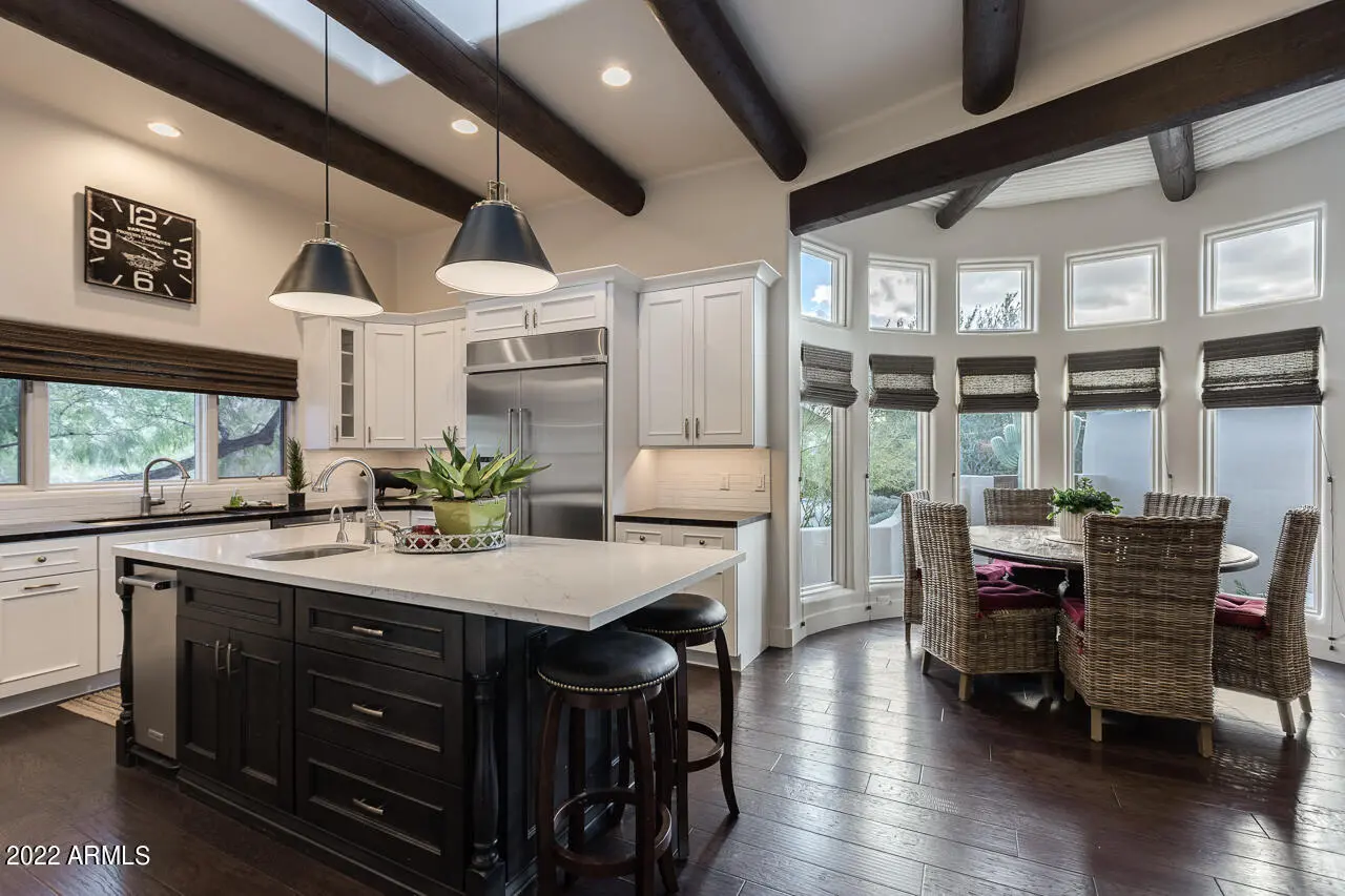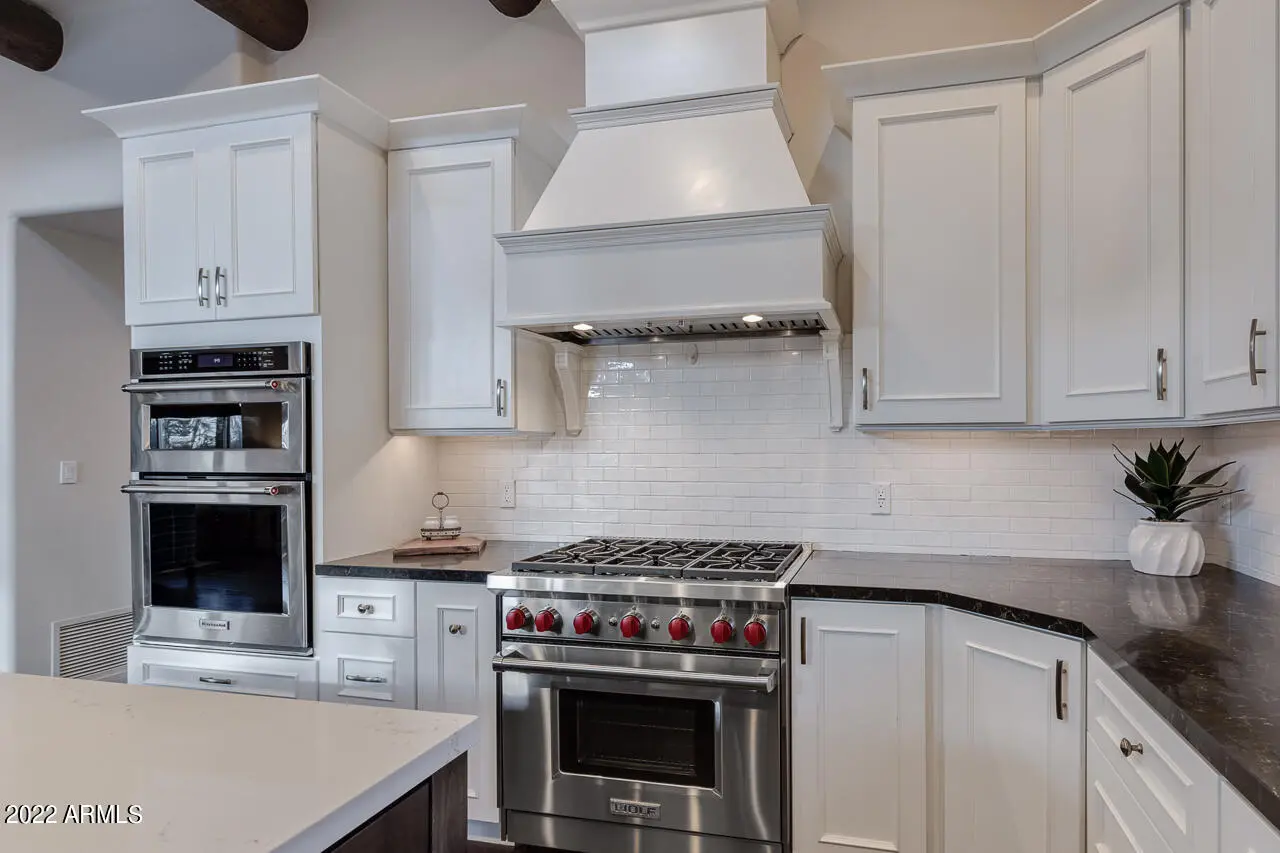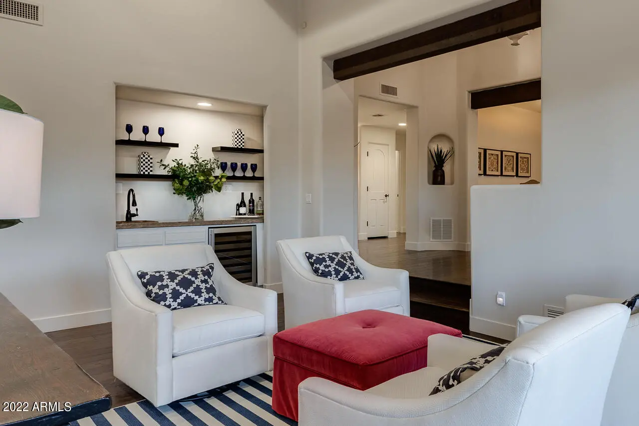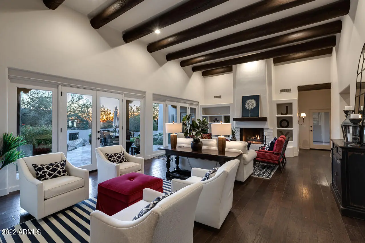 Fully furnished charming Santa Barbara Desert design renovation with abundant style & character starting from the moment you cross the threshold of the hand-carved wood front door. Step into this gorgeous turn-key updated luxury home in the guard gated community of Glenn Moor in Troon. Not one detail has been overlooked on this completely transformed open floor plan that allows natural light to flow throughout the living spaces. This home boasts a large great room with soaring ceilings, bar area for entertaining, custom niches with wall space for exquisite artwork, open formal dining, gourmet kitchen with new quartz countertops, custom cabinetry, pantry, custom pendant lighting, Wolf and Kitchen Aid appliances, Hickory hand scraped wood floors, and 3 custom fireplaces.