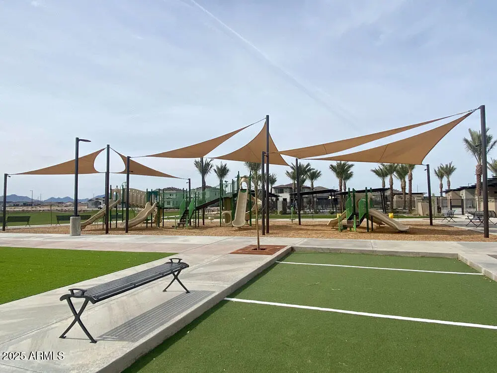 Modern Desert Jade home with 4 bedrooms, 3.5 baths, and 3-car tandem garage on oversized lot in desirable Madera at Queen Creek. Charming paver courtyard leads to open layout with 8' doors and 4-panel glass slider for seamless indoor-outdoor living. Gourmet kitchen features coconut shaker cabinets, quartz counters, handmade-look backsplash, large island, and GE Profile appliances including 36'' gas cooktop, chef's hood, and built-in oven/microwave. Primary suite offers tiled walk-in shower with mosaic floor. Wood-look tile in main areas, plush carpet in bedrooms, black/gold hardware. Resort-style amenities include heated pool, spa, pickleball, basketball, walking paths, playgrounds, and firepit. Close to parks, top schools, shopping, and dining.