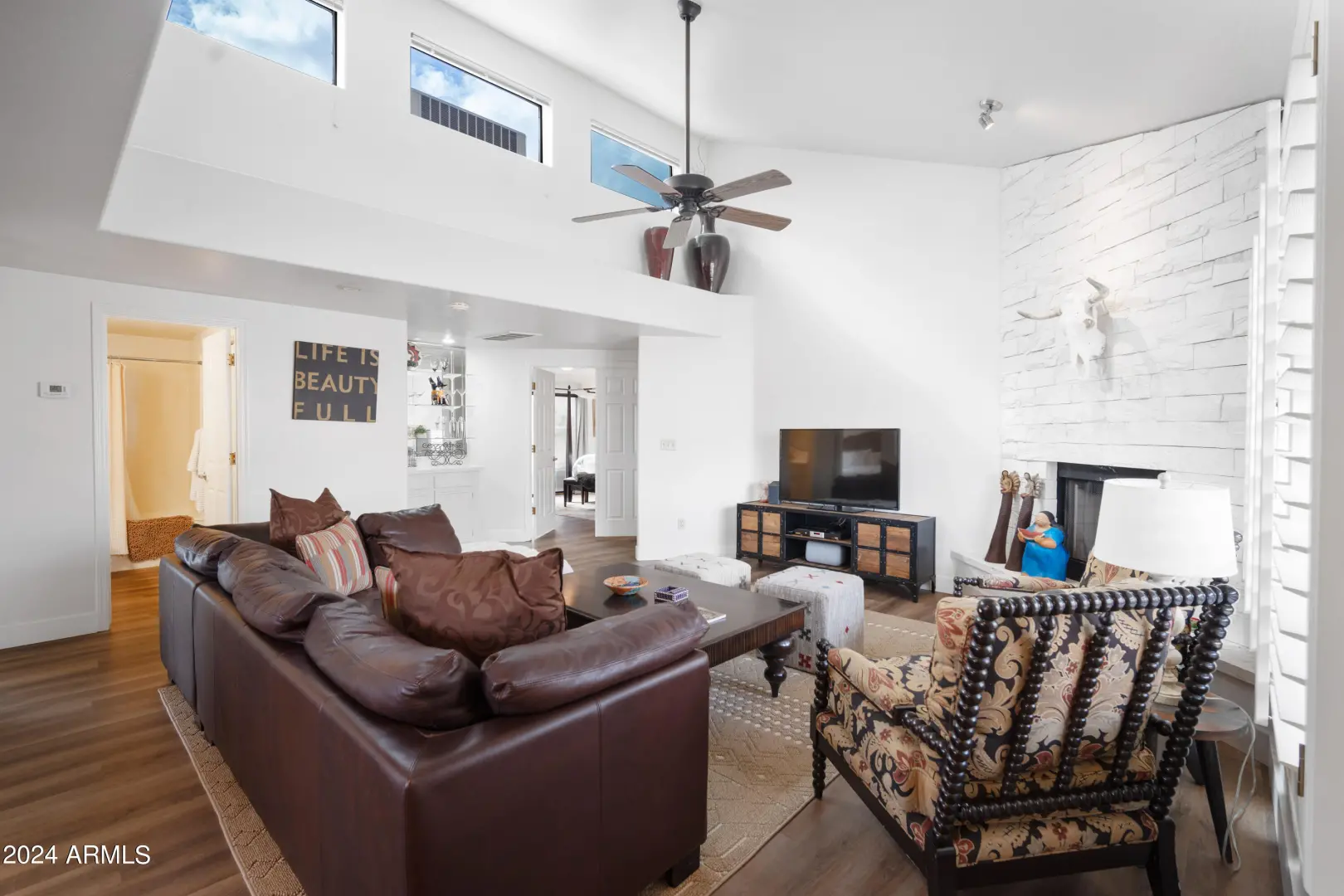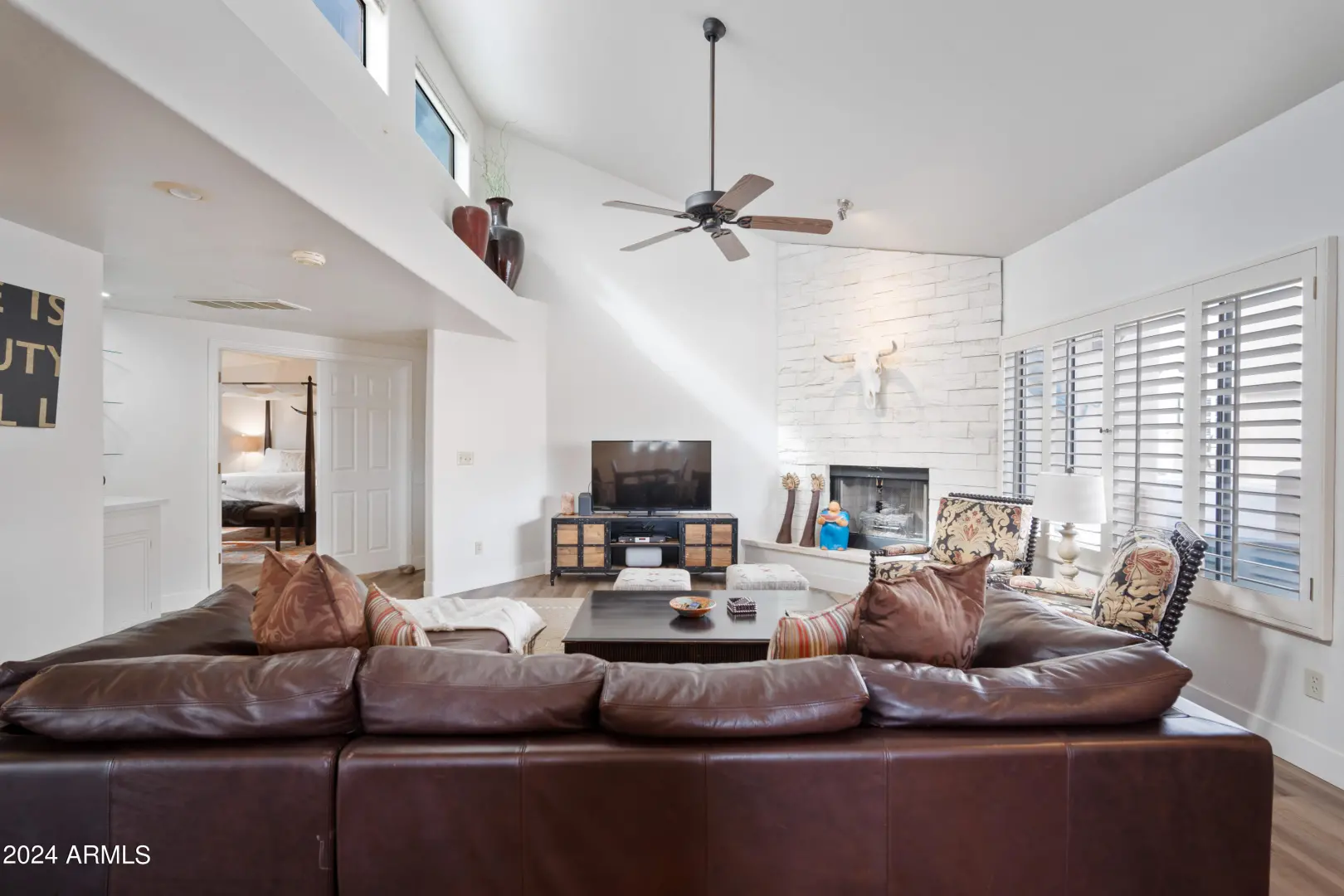 Cute patio home in prime Carefree location! Enjoy the soaring vaulted ceilings in this beautifully updated patio home with cozy fireplace, cute wet bar, luxury vinyl floors, spa-like primary suite, single car garage and relaxing private patio! Walking distance to restaurants, bars, shopping and more! It's fully furnished but furniture can be negotiable with long term lease!