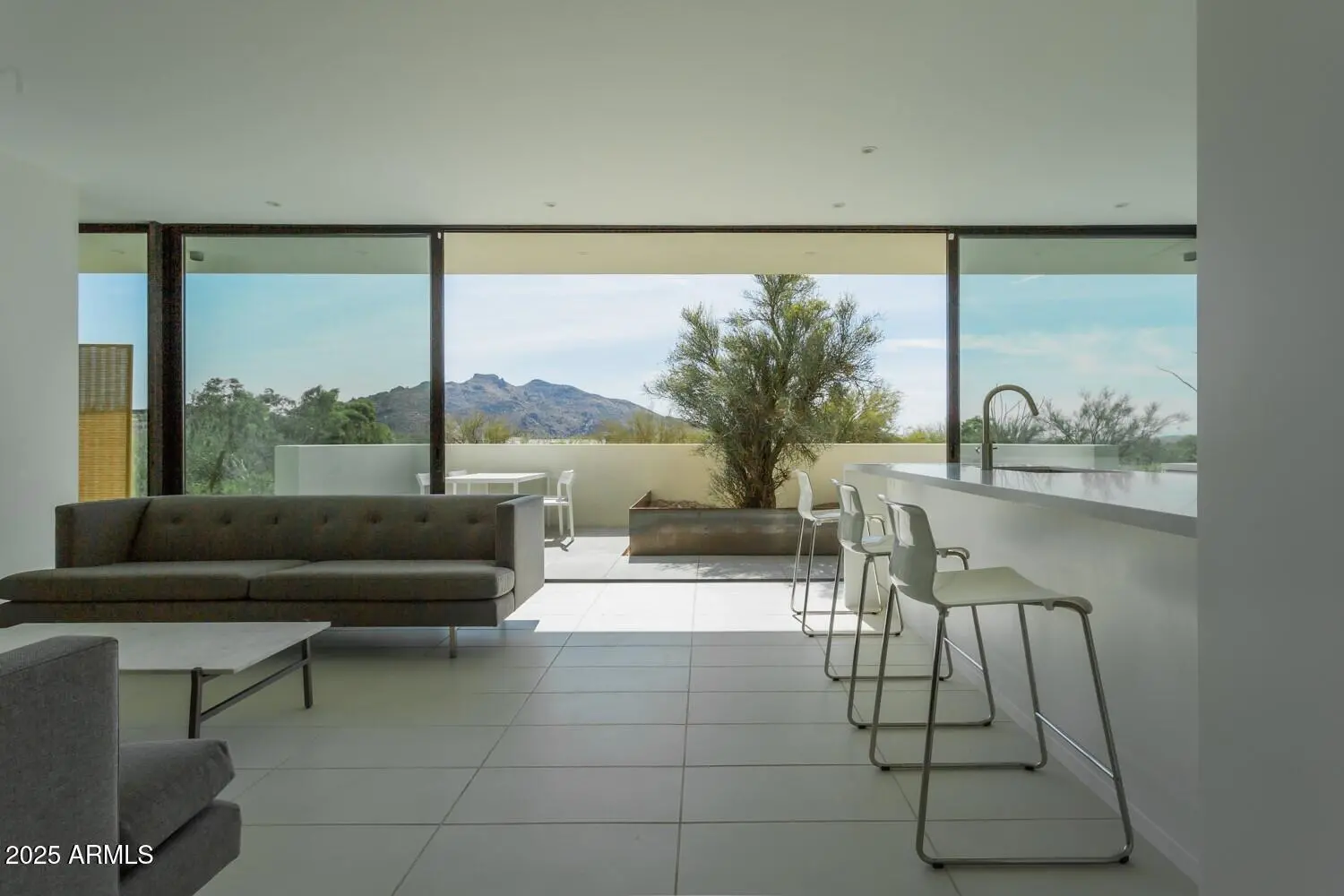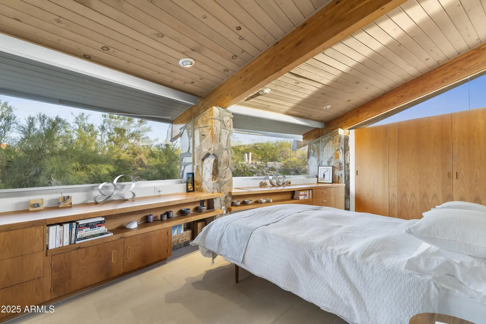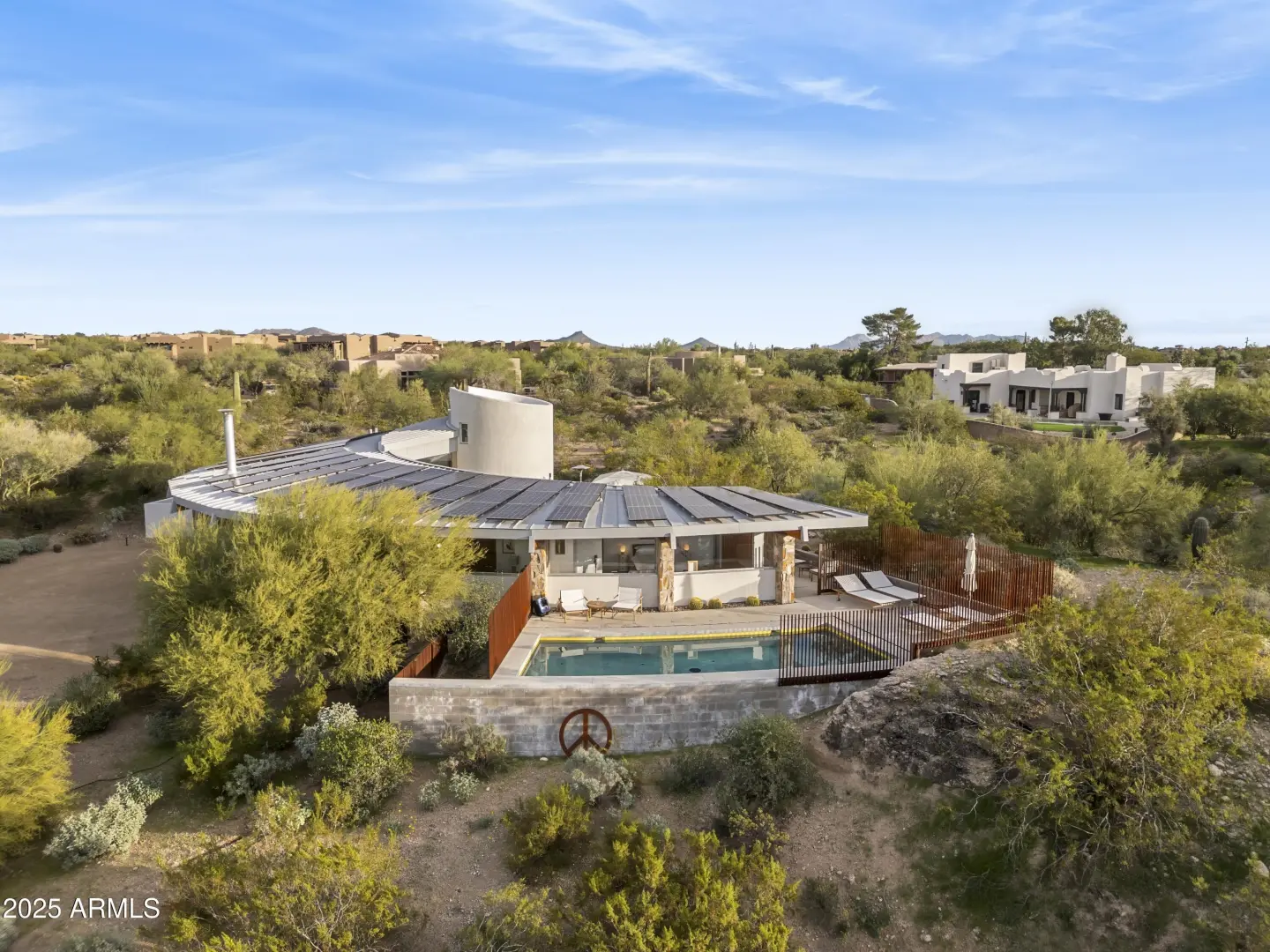 Mid-century Modern meets Clean Contemporary in the heart of Carefree, designed and built by Cave Creek's renowned Taliesin Professor, Michael P. Johnson.The main home was completed in 1980 and fully restored by the original Architect and The Construction Zone in 2019. A detached guest house and the main house pool were also designed by MPJ Studio and built by The Construction Zone in 2019. Both homes have owned solar systems, installed in 2022, which cover all electrical consumption for the current owners. The entry level of the main house has two oversized garage bays (1.5 car each), abundant built-in storage cabinets, an additional refrigerator/freezer, wine refrigerator and the laundry room.The main living space includes a split floor plan with 2 primary bedroom suites,