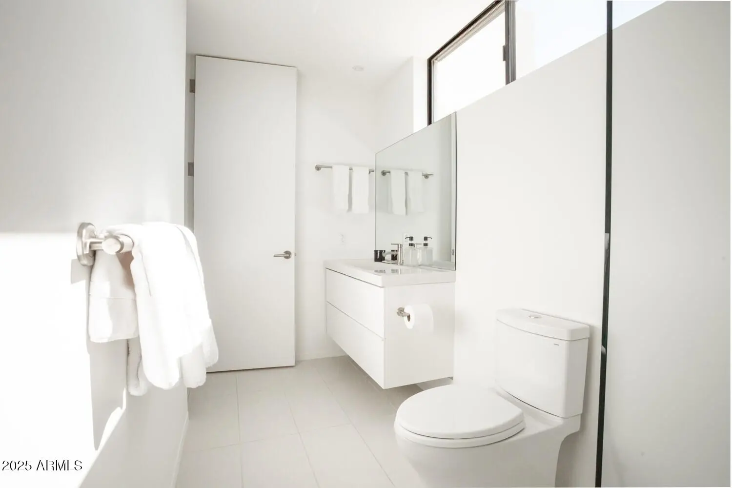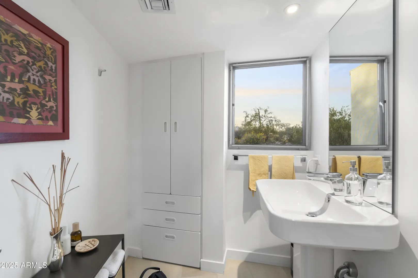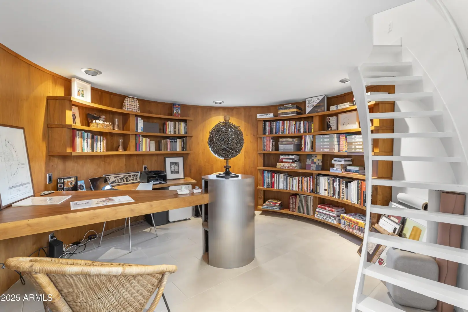 Mid-century Modern meets Clean Contemporary in the heart of Carefree, designed and built by Cave Creek's renowned Taliesin Professor, Michael P. Johnson.The main home was completed in 1980 and fully restored by the original Architect and The Construction Zone in 2019. A detached guest house and the main house pool were also designed by MPJ Studio and built by The Construction Zone in 2019. Both homes have owned solar systems, installed in 2022, which cover all electrical consumption for the current owners. The entry level of the main house has two oversized garage bays (1.5 car each), abundant built-in storage cabinets, an additional refrigerator/freezer, wine refrigerator and the laundry room.The main living space includes a split floor plan with 2 primary bedroom suites,