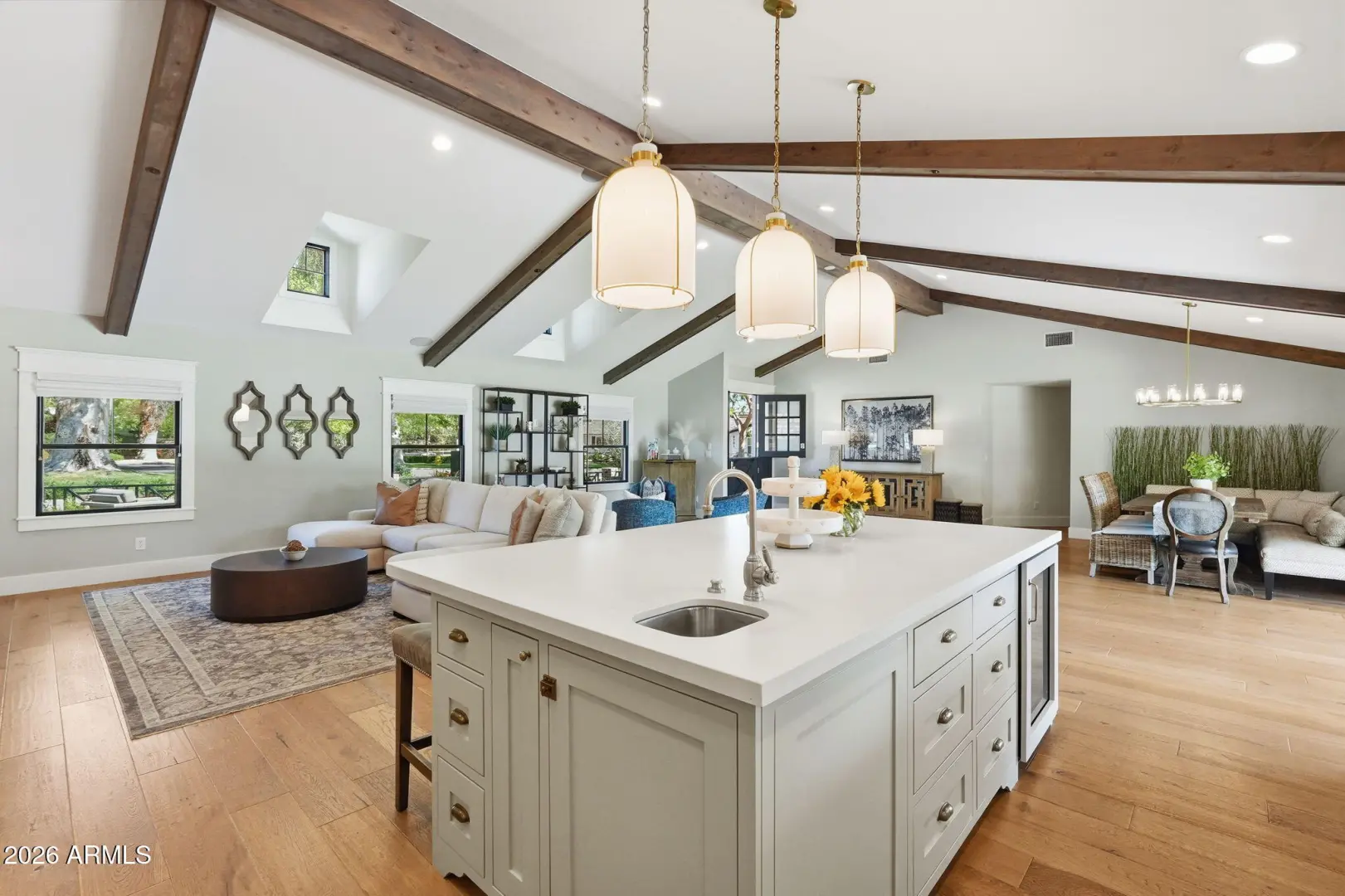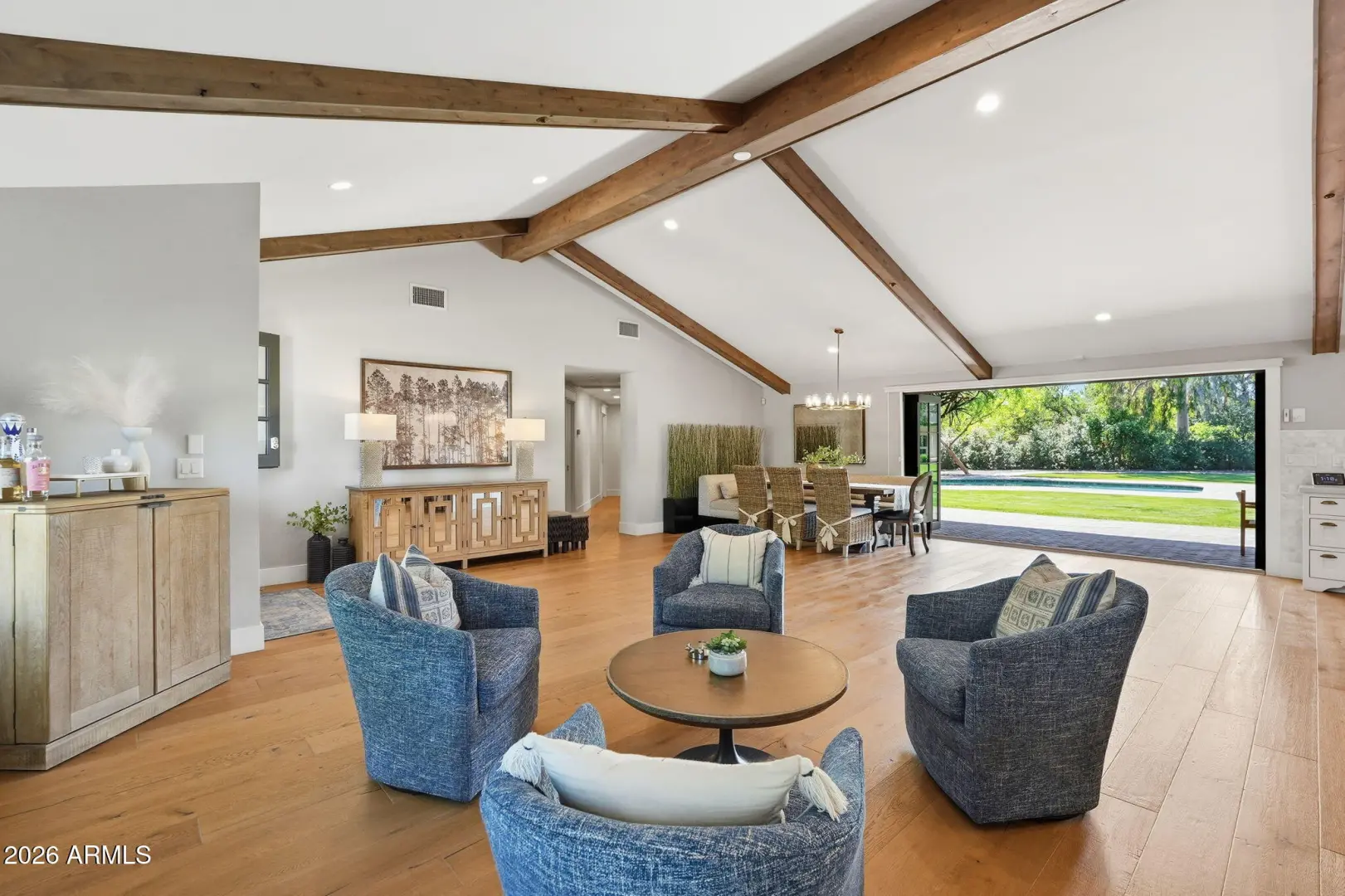 Rarely does a home come available in Paradise Valley Farms that so perfectly captures the charm, space, and lifestyle of this coveted community. Set on over an acre on a premier corner lot in one of Scottsdale's most sought-after acre-lot communities, this stunning Modern Farmhouse embodies the relaxed luxury and outdoor lifestyle that defines PV Farms. Originally built in 1968 as Lot #1 in Paradise Valley Farms, and completely rebuilt in 2018, the home blends timeless farmhouse character with modern design and high-end craftsmanship. The 4,043 SF main residence features five en-suite bedrooms, including a private office with custom built-ins. A welcoming Dutch door opens to the great room with soaring 12'+ vaulted ceilings, wide-plank hardwood floors, and a dramatic 12' wall of glass