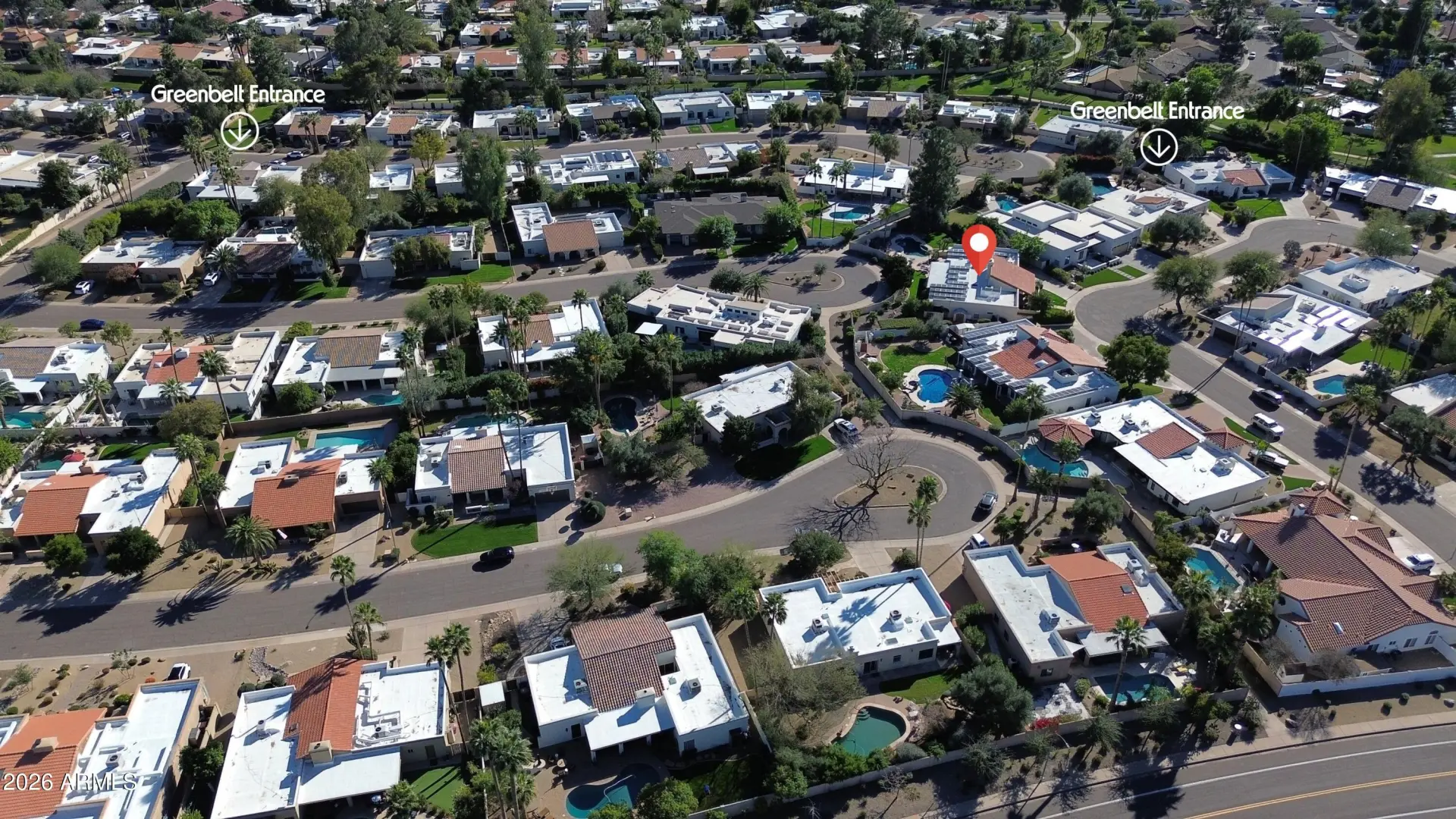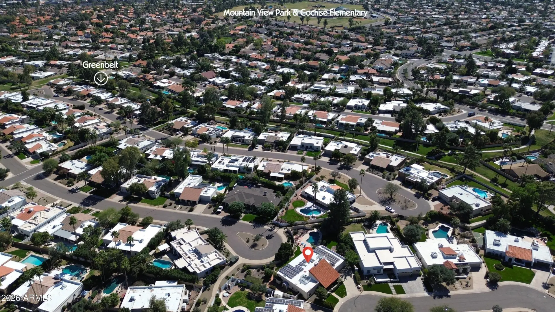 Amazing 16,000+ square foot lot that backs to greenbelt access sidewalks, with two distinct yard section experiences (see site plan). Fully owned solar for low utility bills, Wolf/Subzero appliances, custom cabinetry, 9' ceilings throughout plus living dining vault & generous bedroom sizes. Bedroom 5 is split with full bath access. Four-panel sliding patio door, recessed lighting, surround sound. Rear yard has private garden on the north side, & BBQ, pool/spa, & grassy area on the south side. Home also has a large laundry room & a hard to find epoxied 3-car garage! Easy walk/ride to A+ Cochise Elementary, Mountain View Park, lakes, & restaurants. Fantastic house with an unbeatable ''inside the Arabian loop'' location tucked into a quiet corner of the Tierra Del Norte loop.